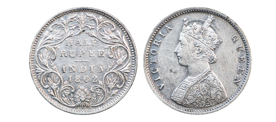 Victoria Queen, Silver Rupee, 1862, Madras Mint, B/II, Without Re-engraving of hair and with enclosed frame effect, (PR # 57/GK # 266), ghost image visible on both sides, strong features, mirror-like surface, superb quality, graded & slabbed by NGC as MS 63, Extremely Rare in this grade.