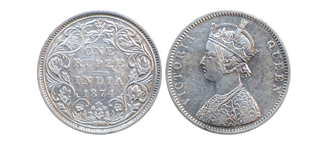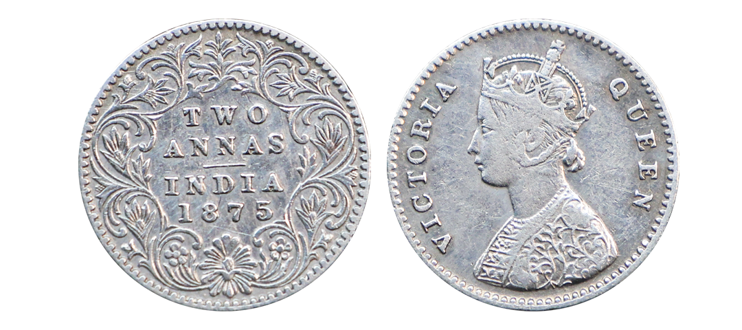 Victoria Queen, silver 2 annas, 1874, Bombay mint, A/I/no mm, PR 516. Very Fine, Rare.