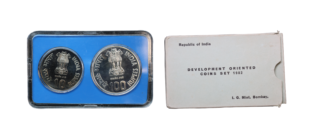 1982, IX Asian Games, UNC set of 2 coins, 100 rupees and 10 rupees, Bombay mint, RB 94, in original mint packing.