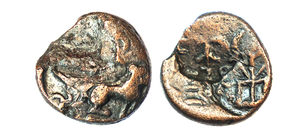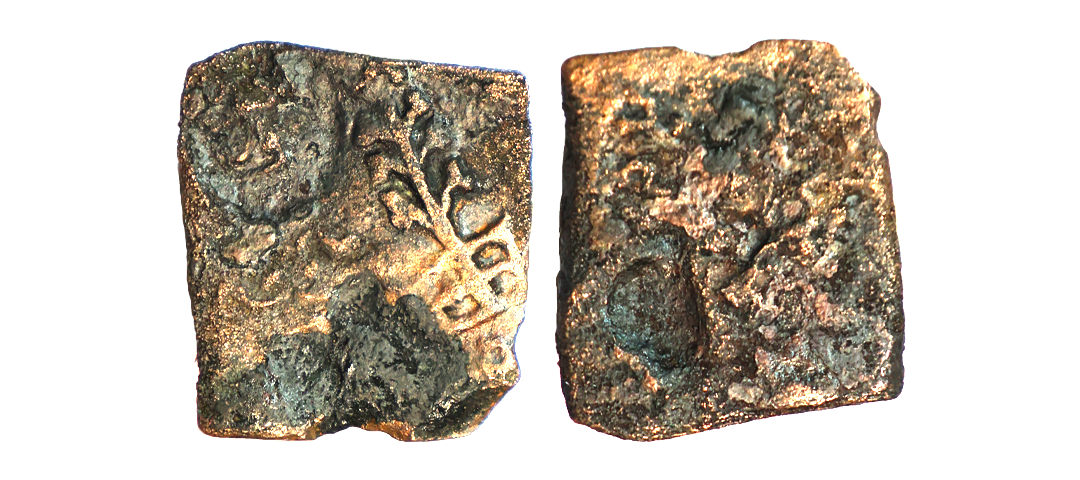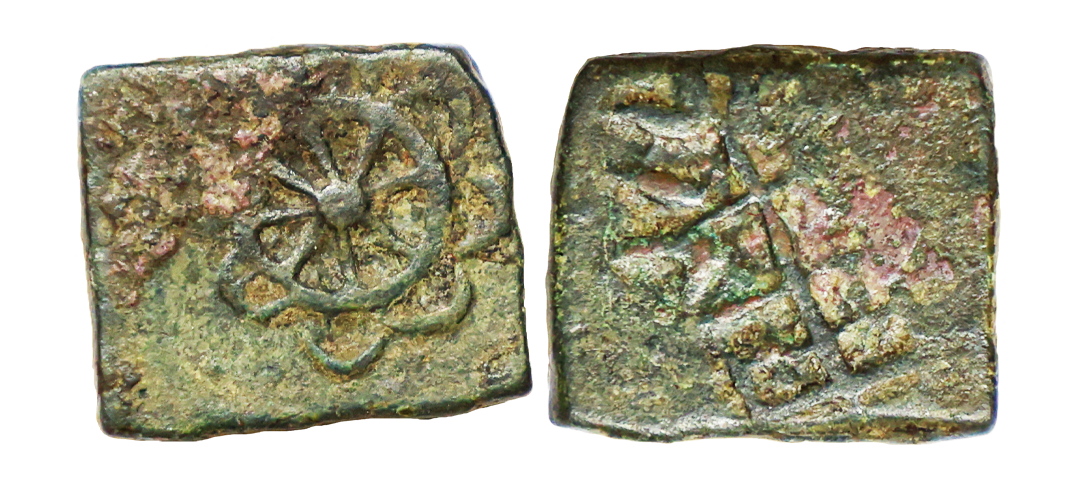 Ancient, Post-Mauryan, Anonymous Issue, Taxila type, Copper Unit, 3.30 gms, Three arched hill with crecent on top, Rev. six-arched hill & river below, fine, very scarce.