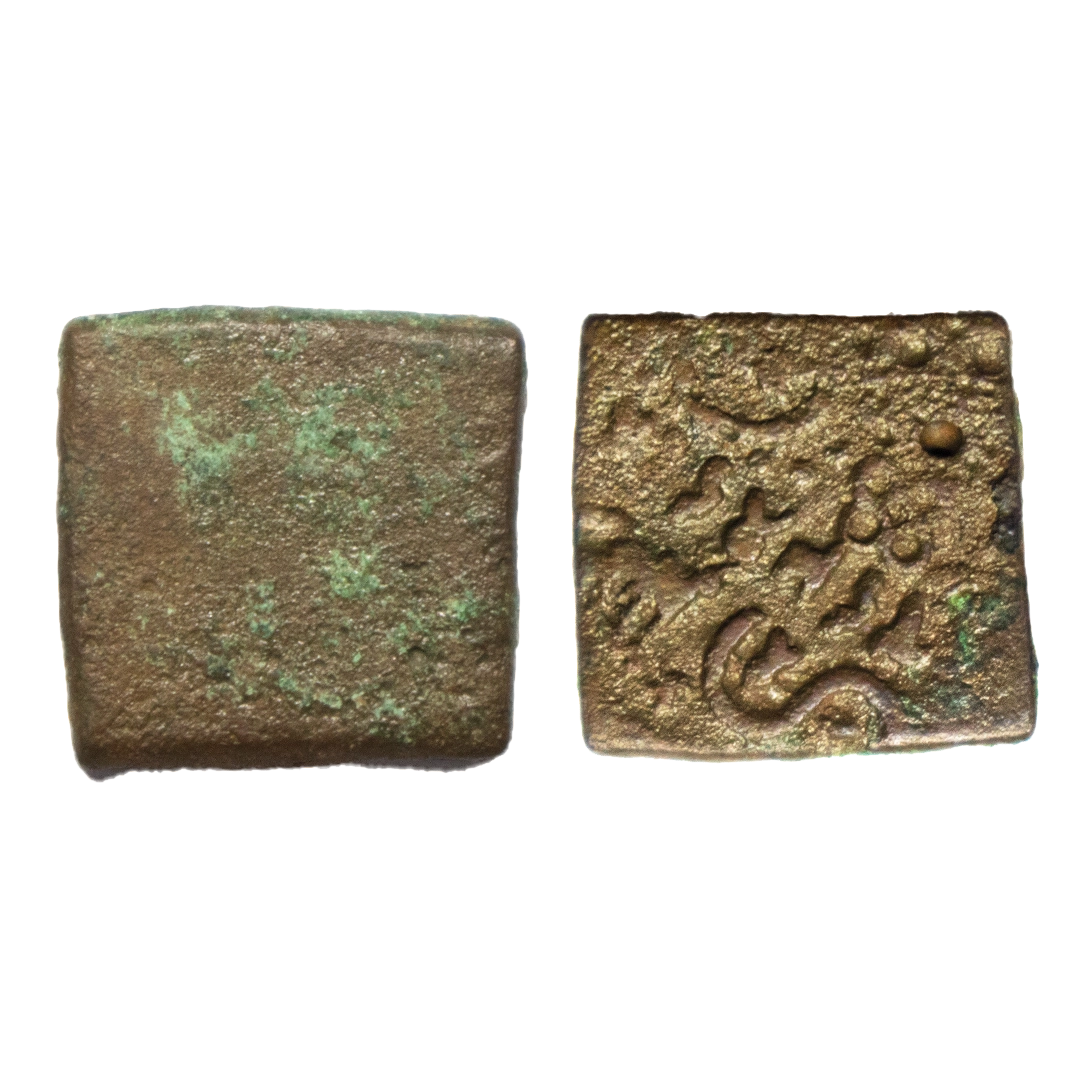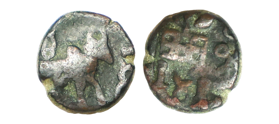 Ancient, Erikacha Monarchical, Sahasasena (c. 1st Century BC), Copper Unit, 1.74 gms, Obv. At the center, punch of a palm tree surmounted on an arched hill, Brahmi legend at top and bottom reading ‘(Ra)jnoSaha/saSenasa’, Rev. Railed Yupa, very fine, very scarce.