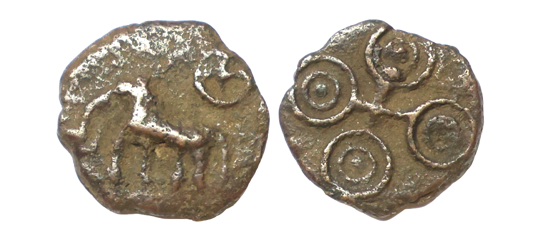 Ancient, North India, Generally Assigned to Sunga Dynasty (1st Century BC), Uninscribed, Cast Copper Unit, 1.90 gms, Obv. Elephant to left, Rev. Three arch hill (Chaitya) surmounted by a crescent, Pieper # 323, about very fine, scarce.