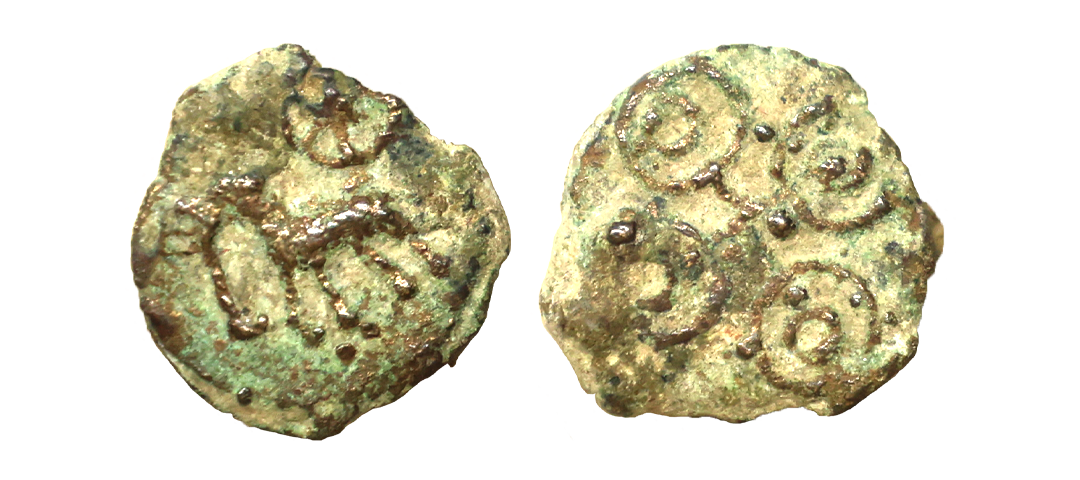 Ancient, North India, Generally Assigned to Sunga Dynasty (1st Century BC), Uninscribed, Cast Copper Unit, 1.90 gms, Obv. Elephant to left, Rev. Three arch hill (Chaitya) surmounted by a crescent, Pieper # 323, about very fine, scarce.
