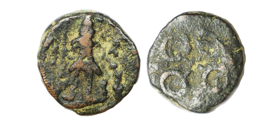 Ancient, Ujjain (2nd-1st Century BC), Copper Unit, 5.75 gms, Obverse: Standing deity Mahakaal, holding a sun standard, Tree-in-railing at left, Six arm symbol at right, Rev. Ujjain symbol, Pieper #631, fine, very scarce.