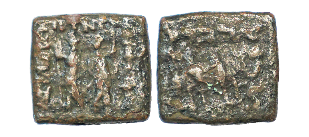Indo-Greeks, Diomedes (115-105 BC), Copper Square Unit, 7.40 gms, Obv. The Dioskouroi standing facing each holding spear with Greek legends around, Rev. bull with Kharosthi legends around, fine, scarce.