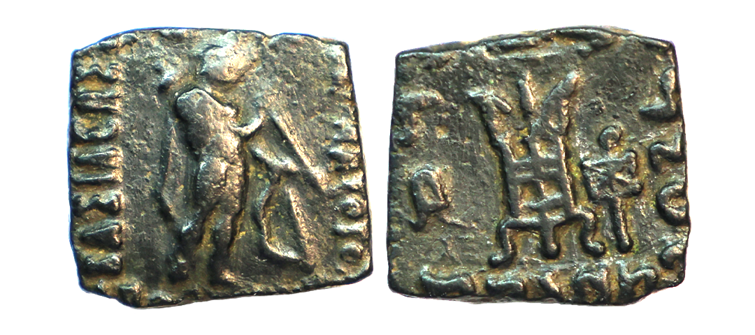 Ancient, Indo-Greeks, Apollodotus II (80-65 BC), Copper Unit, 3.18 gms, Obv. Apollo standing in profile to right, holding bow and arrow, quiver on his back, Greek legends around, Rev. Tripod, monogram at right, Kharoshthi legend around MIG # 427a, fine, scarce.