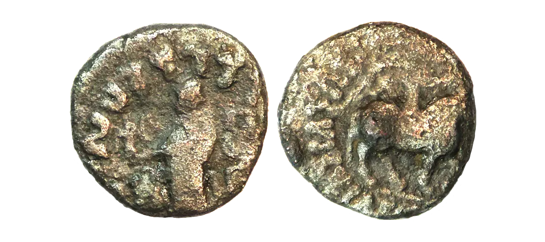 Indo Scythians, Northern Satraps, Mujatria (1-20 AD), Copper Unit, 2.31 gms, Obv. Mujatria on horseback to right, raising his right hand in gesture of greeting, Rev. Apollo seated on stool, Kharosthi legend around, much rarer than the Herakles reverse type of Mujatria, exact type unlisted, fine, extremely rare variety.