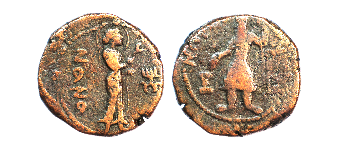 Ancient, Kushanas Dynasty, Soter Megas alias Vima Takto (c. 90th-113th AD), Copper Drachm, 8.44 gms, Obv. Bust of the Kushan ruler to right wielding a spear in front of his face and behind monogram, Rev. The King mounted on a horse to right with Kharoshti legend around and monogram front of horse, Mitch # ACW 2939, fine, scarce.