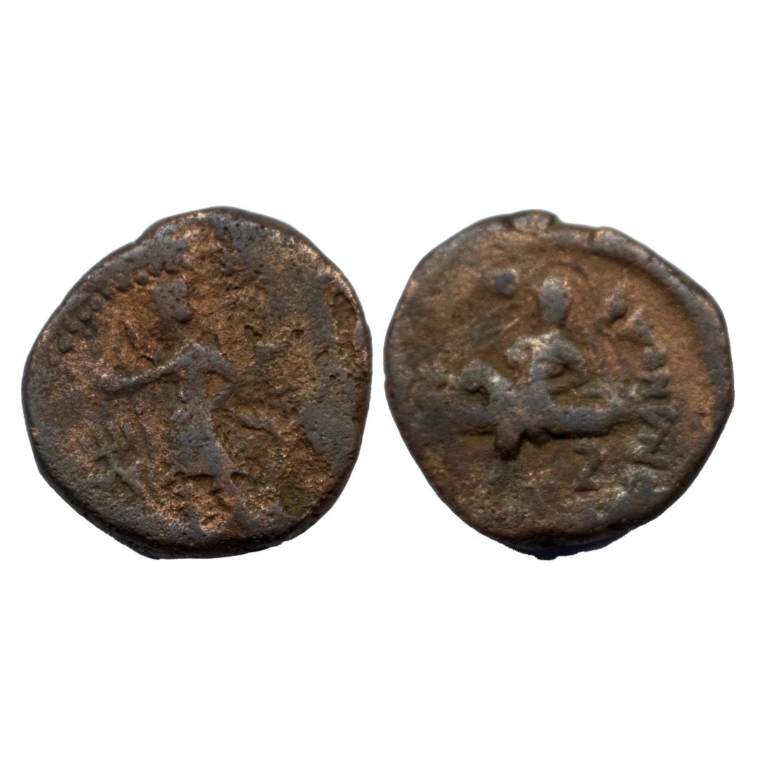 Kushanas, Huvishka (155-190 CE), Copper TetraDrachm, 15.31 gms, Obverse: Nimbate king reclining on couch facing, left leg dangling down; Bactrian legend around, Reverse: Solar deity ‘Mithra’ standing facing left, Greek legend ‘MIIPO’ in right field, Tamgha in left field, Dotted border around, MACW #3234, fine, scarce.