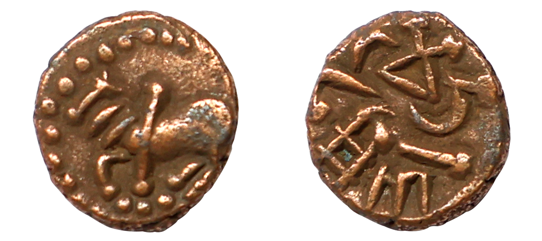 Ancient, Nagas of Padmavati, Skandanaga (310-325 CE), Copper Unit, 2.81 gms, Obv. Bull to right dotted border around, Rev. Brahmi legend ‘Aadirajashribhavanaga‘ around with a trident in centre, Pieper # 1308, very fine, very rare in this grade.