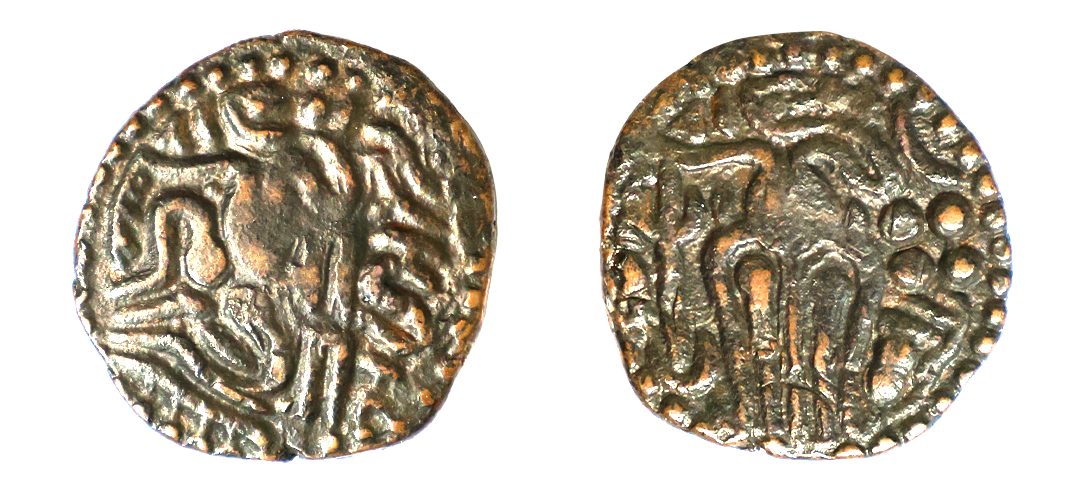 Medieval, Pandyas, Jatavarman Kulasekhara (1190-1216 AD) Copper Unit, 3.15 gms, Obv. Chola style King standing facing, head to right, holding rosebud in his left hand, Rev. Fish and other symbols, fine, very rare.