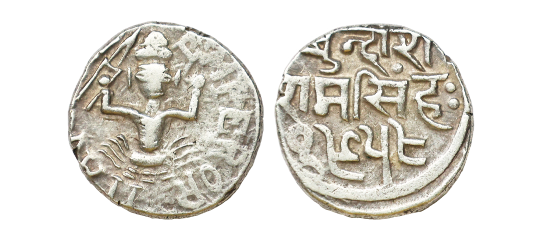 Bikaner State, Dungar Singh (AH 1289-1305, 1872-1887 AD) INO Queen Victoria, Silver ½ Rupee, 5.56 gms, Bikaner Mint, VS 1916, Obv: "aurang-o-arai-hind-o-inglistan-queen-victoria", Rev:'zarb sri bikaner' symbols of the ruler VS 1916, very fine+, very rare.