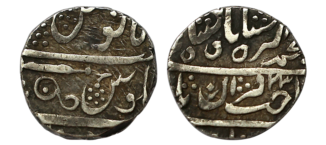 Gwalior State, Daulat Rao (AH 1209-1243, 1794-1827 AD), INO Shah Alam II (AH 1174-1221, 1759-1806 AD), Silver 1/8 Rupee, 1.42 gms, Dar ul Fateh Ujjain Mint(by type), similar to KM # 241, very fine, scarce.