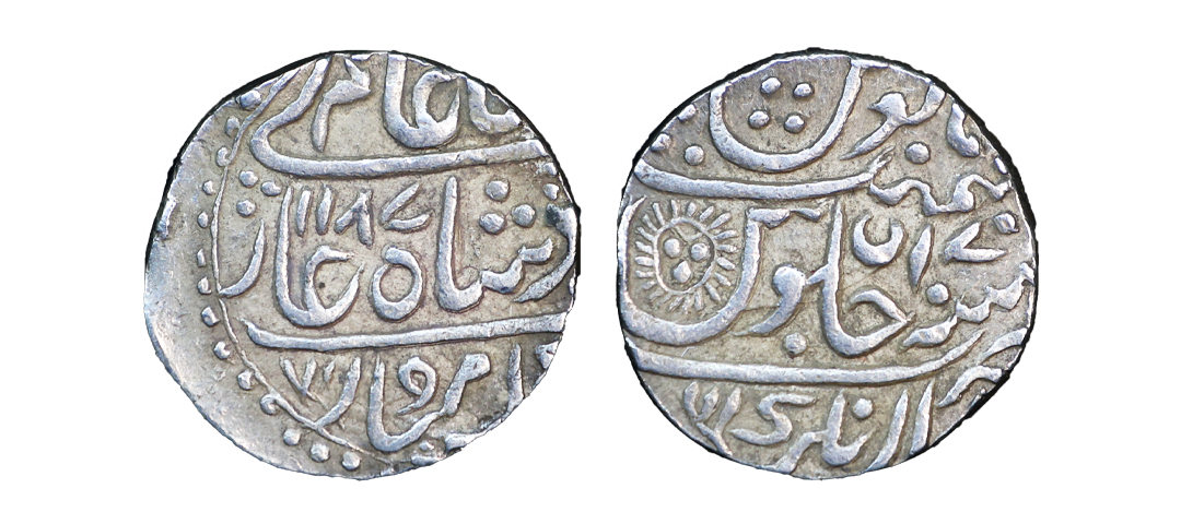 Indore State, INO Shah Alam II (AH 1174-1221, 1759-1806 AD), Silver Rupee, 11.28 gms, Malharnagar Mint, AH 1187, RY 17, KM #76, very fine, scarce.