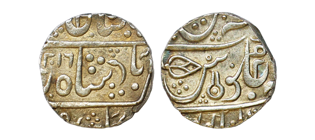 Indore State, INO Shah Alam II (AH 1174-1221, 1759-1806 AD), Silver Rupee, 11.32 gms, Maheshwar Mint, AH 1216, KM # 58.2, very fine+, scarce.