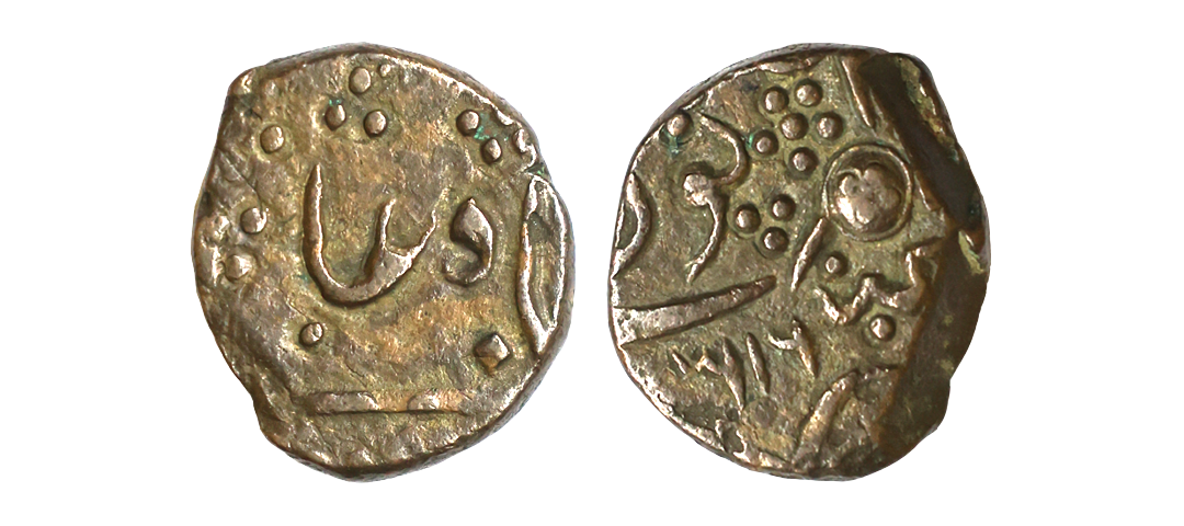 Junagadh State, Bahadur Khan (AH 1226-1256, VS 1868-1897, 1811-1840 AD), INO Muhammad Akbar II (AH 1221-1253, 1806-1837 AD), Copper Dokdo, 7.93 gms, Junagadh Mint, AH 1247, Obv: sri diwan in nagari, Rev: hijiri date and nagari legend, KM # 11, very fine, rare.