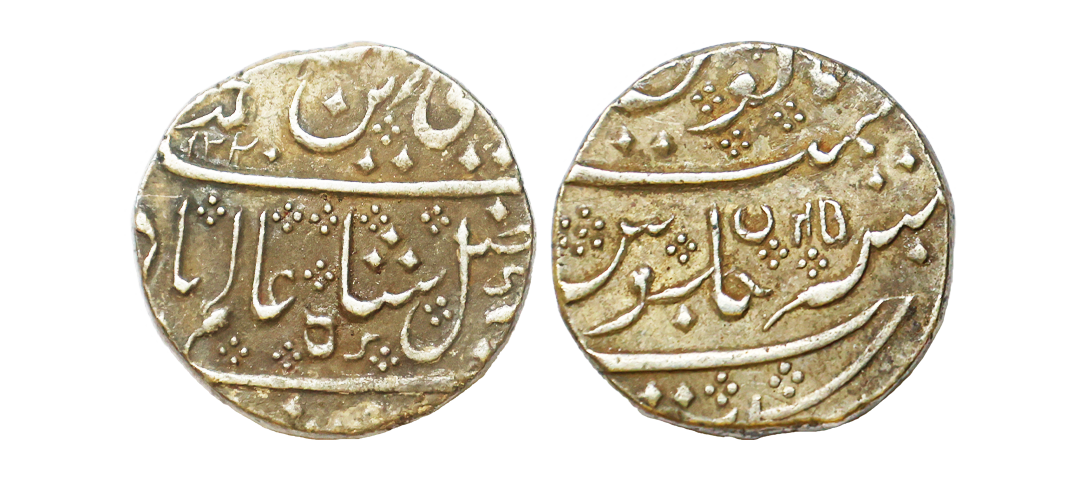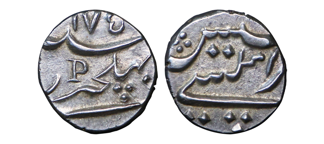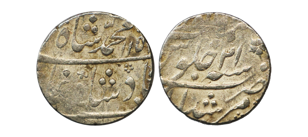 Indo-French, Muhammad Shah, silver rupee, actually struck at Chandernagar, but with mint name Murshidabad on the coin, distinguished by the 5 petal flower to right of the regnal year on reverse, AH 11xx/RY 21, KM 27, Lec 170, 11.57g, Very fine, Very scarce.
