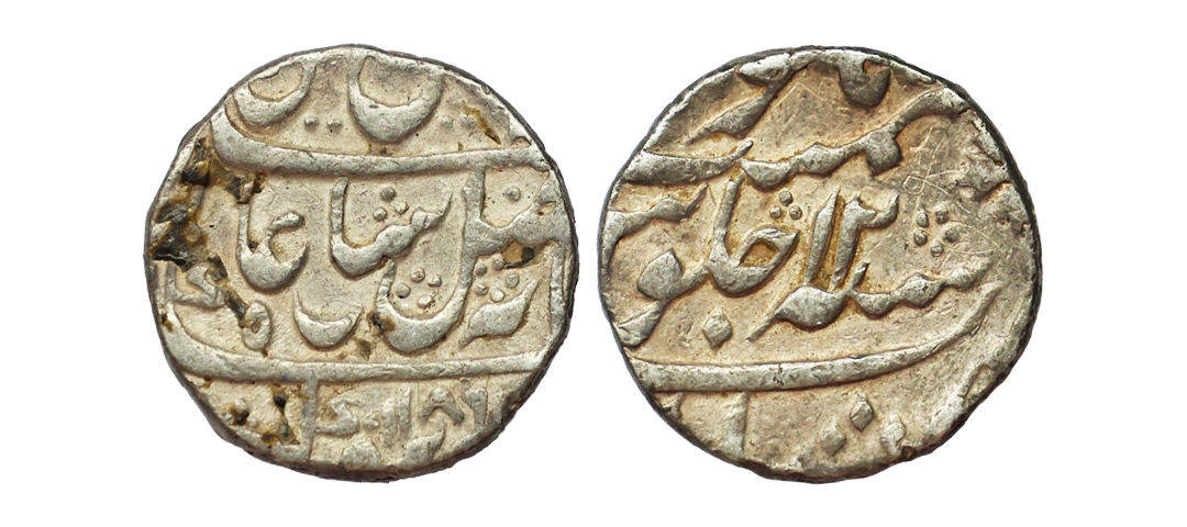 Bengal Presidency, INO Shah Alam II (AH 1174-1221, 1759-1806 AD), Silver Rupee, 11.55 gms, Murshidabad Mint, AH 1186, RY 12, KM # 84.2, very fine, scarce.