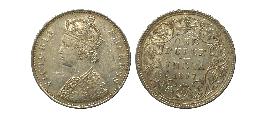 Victoria Empress, Silver Rupee, 1877, A3/II(i), Dot, Beautiful die doubling in Victoria's jabot, Rare.