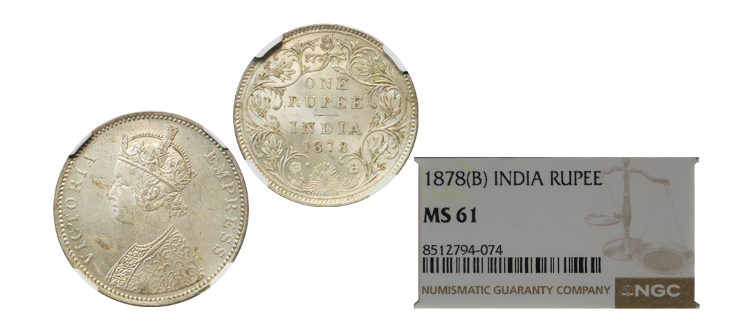 Victoria Empress, Silver Rupee, 1878, Bombay Mint, A3/II(i), dot, Superb and Flawless Specimen with Excellent Mint Bloom. Graded by NGC as MS62 , Extremely Rare.