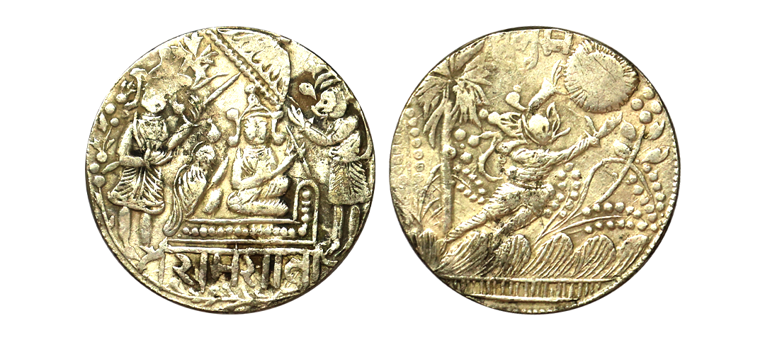 Ram Darbar, Silver Temple Token, 11.40 gms, Obv. Durbar scene, Rama and Sita seated on durbar platform, attendant standing on the left holds parasol above, Rev. Lord Ram & Lakshman, very fine, scarce.
