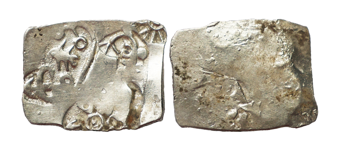 Magadha Janapada, Series I (500-400 BC), Silver Karshapana, 3.55 gms, Sun, six armed symbol, bow & arrow, and fish with geometric symbols, Uniface, exact combination unlisted, very fine+, rare.