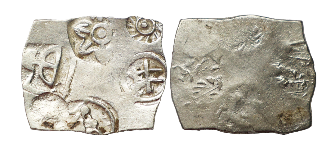 Magadha Janapada, Series I (500-400 BC), Silver Karshapana, 3.34 gms, Sun, six armed symbol, bow & arrow, and geometric symbols, Uniface, Gupta & Hardaker Series I #208a, very fine+, rare.