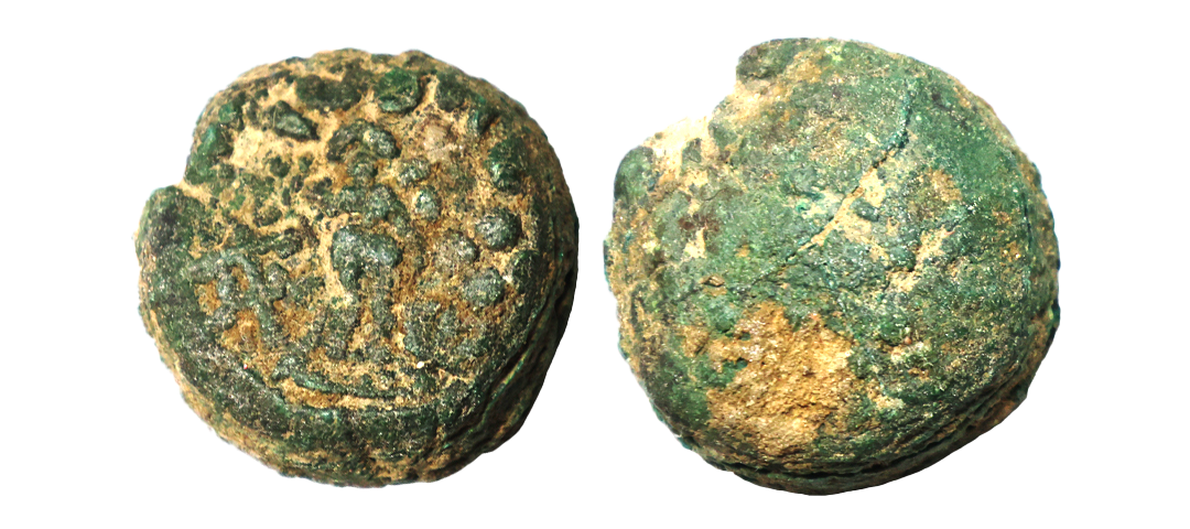 Post Mauryan, Taxila Region, Punch Mark type, Copper Unit, 11.98Grms, OBV: Lion waling to left above svastika and front of three arched hill with crescent symbol, REV: Elephant walking to right above three arched hill with crescent symbol. (Bopearachchi & Rahman # 138). Fine.
