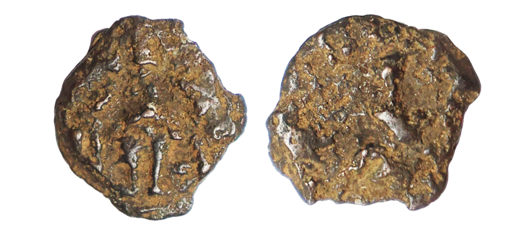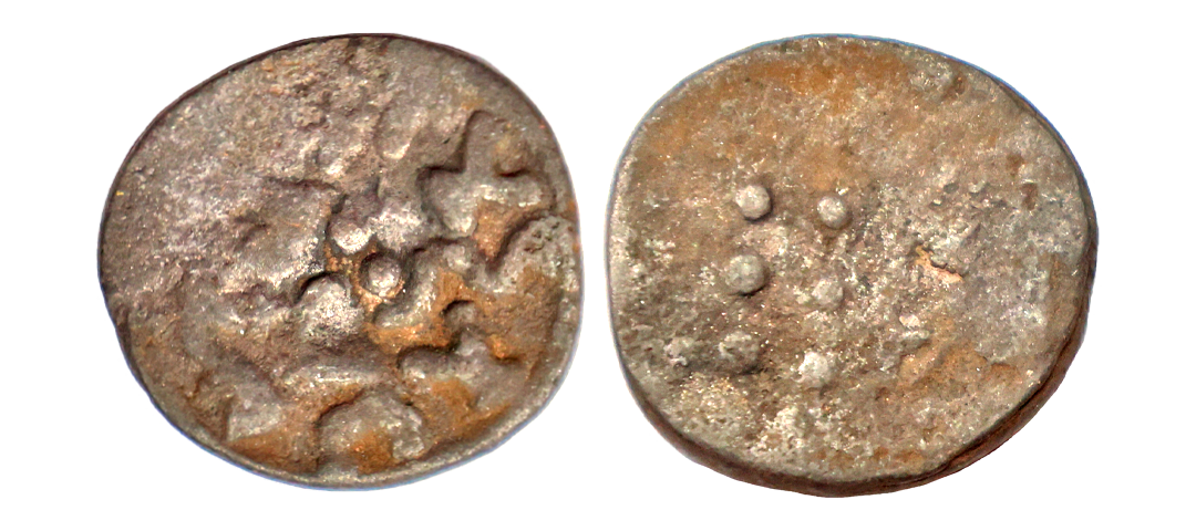 Ancient, Local rulers of Mathura, Brahmamitra (c. 200-100 BC), Copper Unit, 10.74 gms, Obv. Lakshmi standing facing, holding flower in her raised right hand; to left, tree in railing; to right, four-orbed Ujjain symbol, partial Brahmi legend on top reading “SurYaMiTaSa”, Rev. Blank, fine, rare.