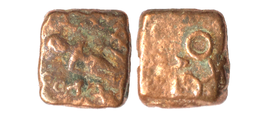 Ancient, Ujjain (2nd-1st Century BC), Copper Unit, 4.34 gms, Mahakal Type, Obverse: Standing Mahakaal, holding a standard, Tree-in-railing at left, Rev. traces of Ujjain symbol, Pieper #630, fine, scarce.