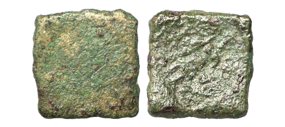 Ancient, Post Mauryan Ujjain, (2nd-1st Century BC), Copper Unit, 0.66 gms, Obv. Standing deity with crested hair to left, stick in left handm kamandal in right hand, railed tree in left field, Rev. Ujjain symbol, Pieper #672, very fine, very scarce.