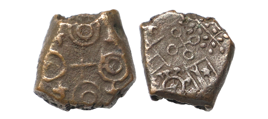 Ancient, Post Mauryan Ujjain, (2nd-1st Century BC), Copper Unit, 4.52 gms, Obv. Standing male & female figure, Rev. Ujjain symbol, Pieper #692, fine, very scarce.