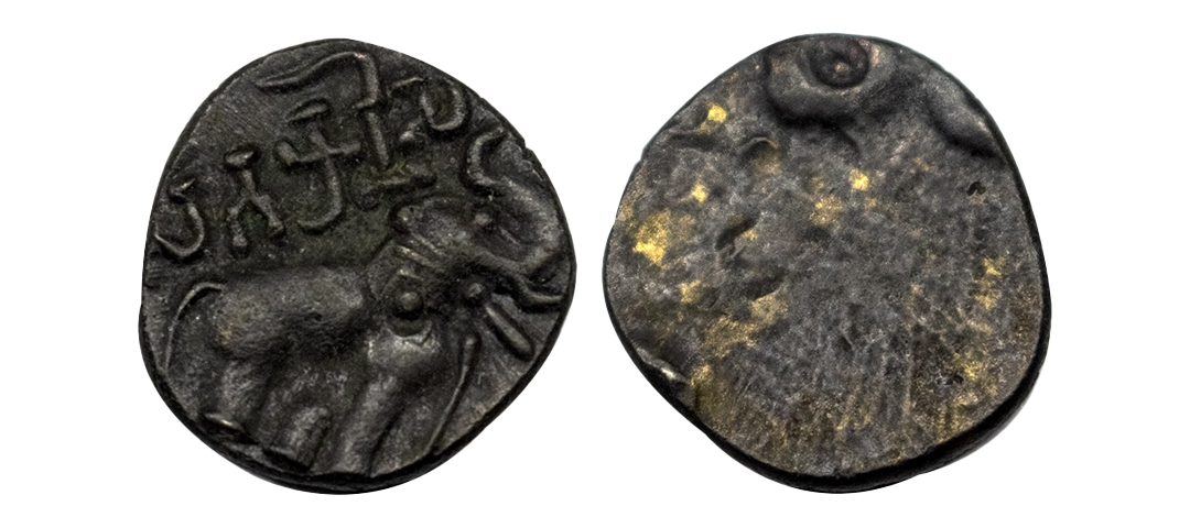 Satavahanas, Siri Satakarni (1st Century BC), Potin Unit, 3.51 gms, Obv. Elephant walking to right with upraised trunk, and Brahmi legend '(Siri sa)takani(sa)' above, Rev. Four orb ujjaini symbol small pellet in each orb. (V. V. Mirashi, # PL. III 24, Studies in Indology Vol. III, Nagpur). very fine, scarce.