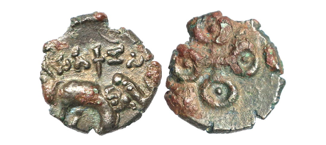 Satavahanas, Siri Satakarni (1st Century BC), Potin Unit, 3.58 gms, Obv. Elephant walking to right with upraised trunk, and Brahmi legend 'Siri sataka(nisa)' above, Rev. Four orb ujjaini symbol small pellet in each orb. (V. V. Mirashi, # PL. III 24, Studies in Indology Vol. III, Nagpur). very fine, scarce.
