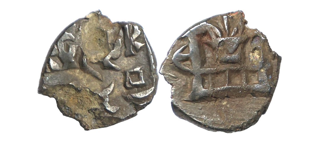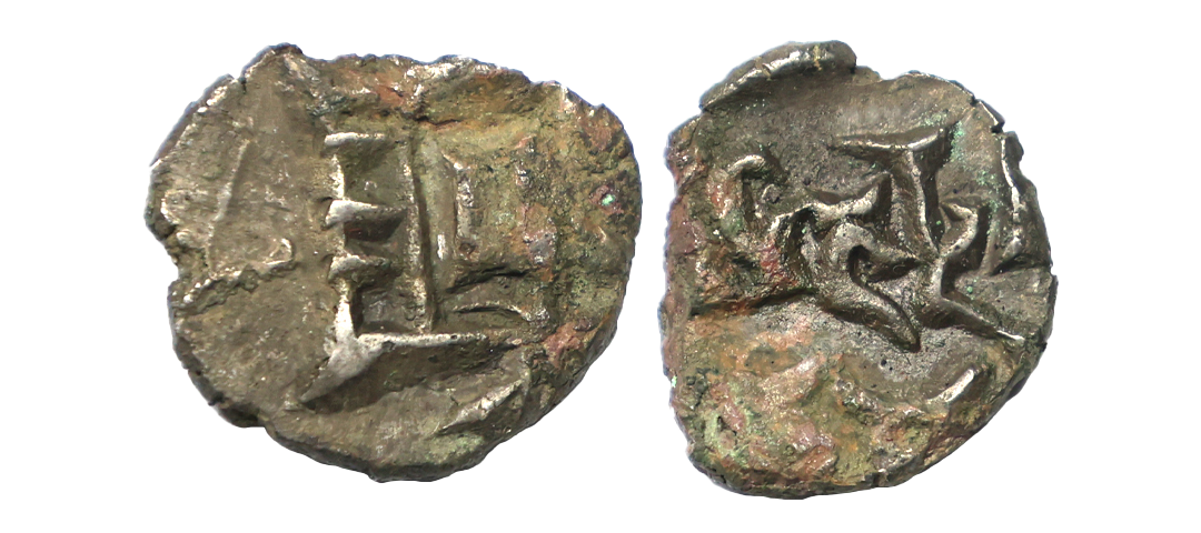 Ancient, Panchala, Yajnabala (1st Century BC), Copper Unit, 1.88 gms, Obv. Curved symbol on a pedestal, Reverse: Three Panchala symbols on top, Brahmi legend ‘Yajnabalasa’ below, Pieper # 1369, about very fine, very scarce.