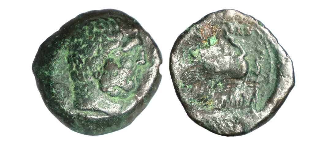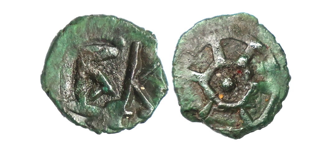 Ancient, Pre-Kushana, Panchala, Vishnumitra (c. 1st Century AD), Copper Unit, 3.89 gms, Obv. Deity (Vishnu) standing on a pedestal, holding conch, chakra, mace and lotus, Rev. A square incuse with row of Panchala symbols on top and Brahmi legend ‘ViShnuMiTraSa’ below, Pieper #1335, very fine, very rare in this grade.