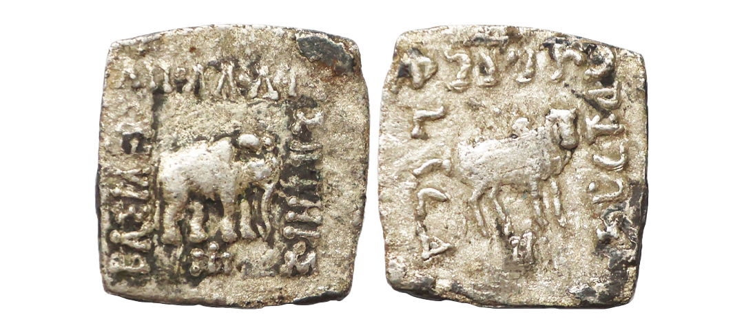 Ancient, Greco Bactrians, Euthydemos I Theos Megas (230-220 BC), Bronze Unit, 6.60 gms, Obv. Head of Herakles facing to right, a dotted border around, Rev. horse prancing to right, Greek legend on upper and lower fields reading ‘BAΣIΛEΩΣ EYΘYΔHMOY’, about very fine, very rare.