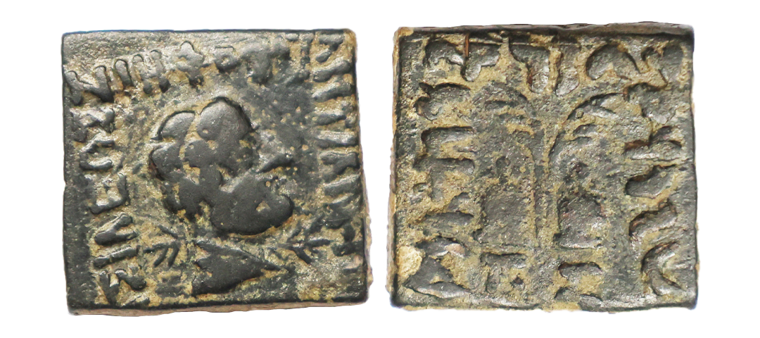 Ancient, Indo-Greeks, Menander I (c. 160-145 BC), Silver Drachm, 2.29 gms, Obv: Diademed and draped bust of the ruler to right around Greek legend ‘BASI?EOS SOTHPOS MENAN?POY (BasileosSoterosMenandrou)’, Rev: Athena Alkidemos standing leftholding horizontal shield on outstretched left arm, hurling thunderbolt with right hand, monograms to left side, around Kharoshthi legend ‘MaharajasaTratarasaMenamdrasa’, Bop & Rahman # 340-433, fine+, very scarce.