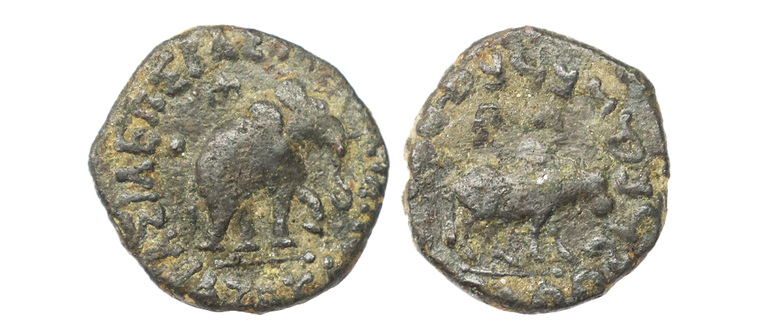 Ancient, Indo-Scythians, Maues (c. 1st Century BC), Bronze Unit, 8.17 gms, Obv. Elephant to right within a rectangular frame, Greek legend around on three sides partially reading ‘BAΣIΛEΩΣ BAΣIΛEΩN MEΓAΛOY MAYOY’, Rev. King seated facing and crosslegged on a couch within a rectangular frame, Kharoshthi legend around on three sides partially reading ‘RajatirajasaMahatasaMoasa’, Senior # 15.1, fine, rare.