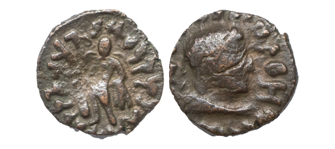 Kushanas, Kujula Kadphises (c. 50-90 AD), Copper Drachma, OBV: Bust of king facing to right, around Greek legend, REV: Heracles standing facing to left, holding clubs and around Kharoshthi legend. (Pieper # 1721). Fine+.