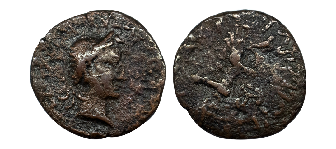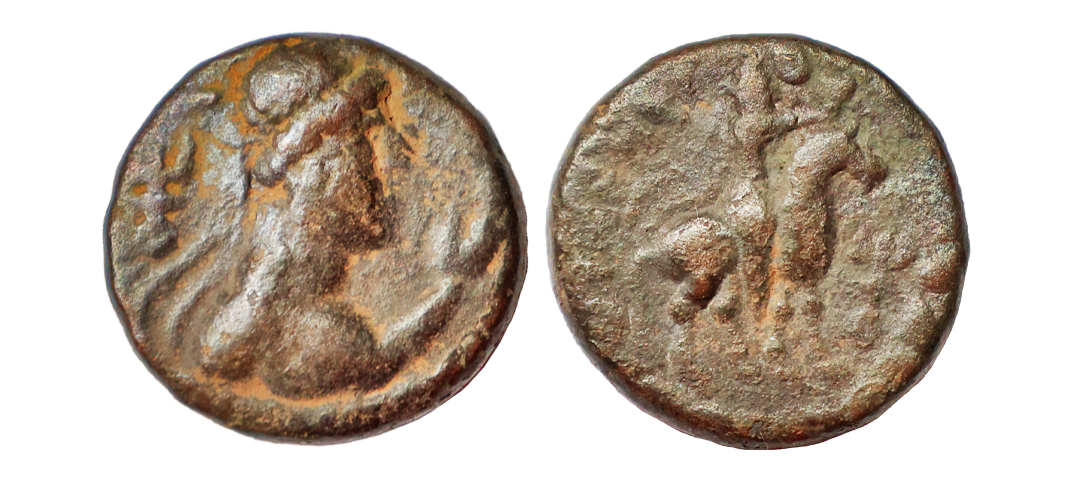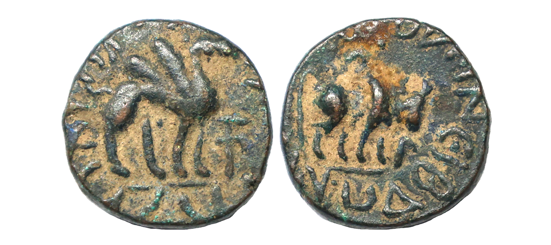 Ancient, Kushanas, Kujula Kadphises (c. 1st Century BC), Copper Unit, 7.61 gms, Obv. diademed bust to right, Greek legend around reading ‘BAΣIΛEΩΣ ΣTHPOΣΣV EPMAIOV’, Reverse: Hercules standing facing, holding club and lion skin, Kharoshti legend around reading ‘Kujula Kasasa Kushana YavugasaDhramathidasa’, MAC # 2844, fine+, scarce.