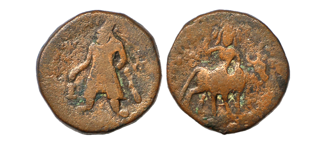 Kushanas, Kujala Kadphisis (c. 1st Century AD), Chach, Bronze Dichalkon, 3.15 gms, Obv: Roman style diademed bust to right, Greek legend around partially reading ‘KOZOΛA KAΔAΦEC XOPANOV ZAOOV’, Rev: King seated to right in curule chair, Kharoshti legend around partially seen ‘KhushanasaYauasaKuyulaKaphasa Sacha Dhramatidasa’, MAC # 2878-79, fine, very scarce.