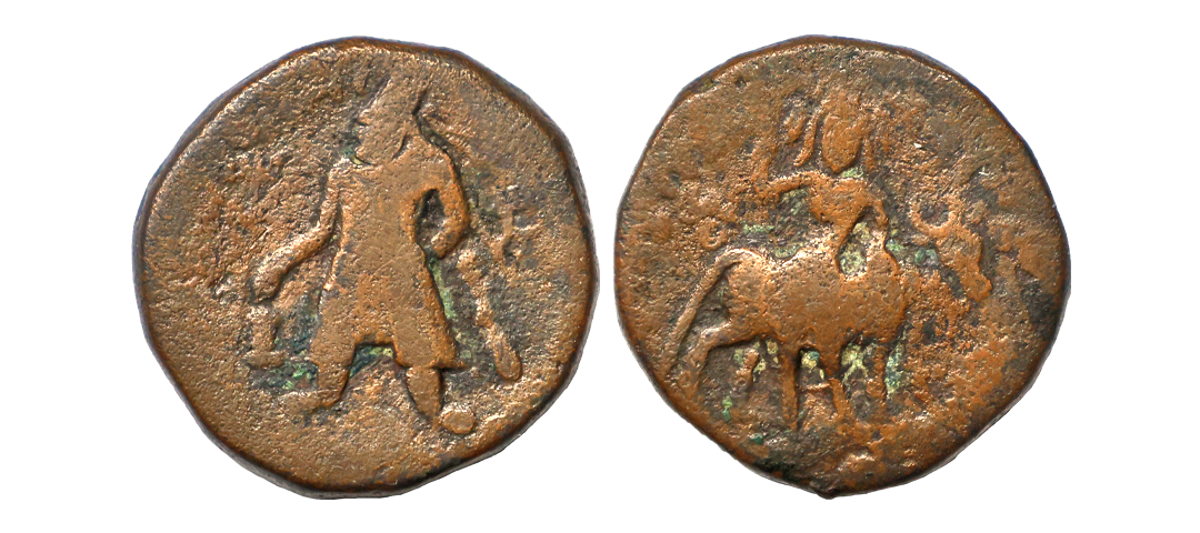 Kushana Empire, Wima Kadphises (c. 113-127 AD), Copper Tetradrachm, 16.61gm, Bi-lingual type, fine, scarce.