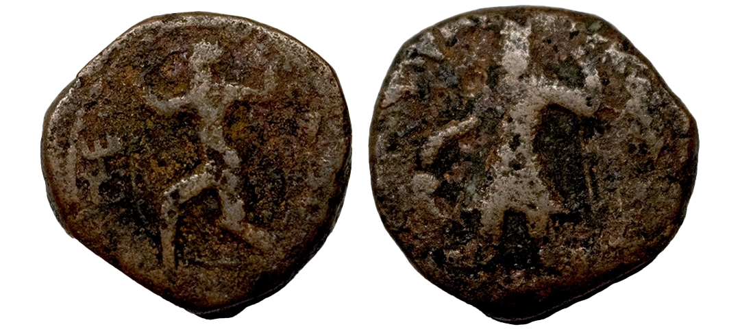 Ancient, Kushans, Kanishka I (128-150 AD), Copper Tetradrachm, 16.83 gms, Obv. Crowned, diademed king standing, holding staff and sacrificing at altar at left, Bactrian legend 'ÞAO ΚA-NΗΡKI' around, dotted border around, Rev. Wind god Oado running, holding cloak above himself, Bactrian legend 'ΟΑΔΟ' to right, MK #816, about very fine, very scarce.