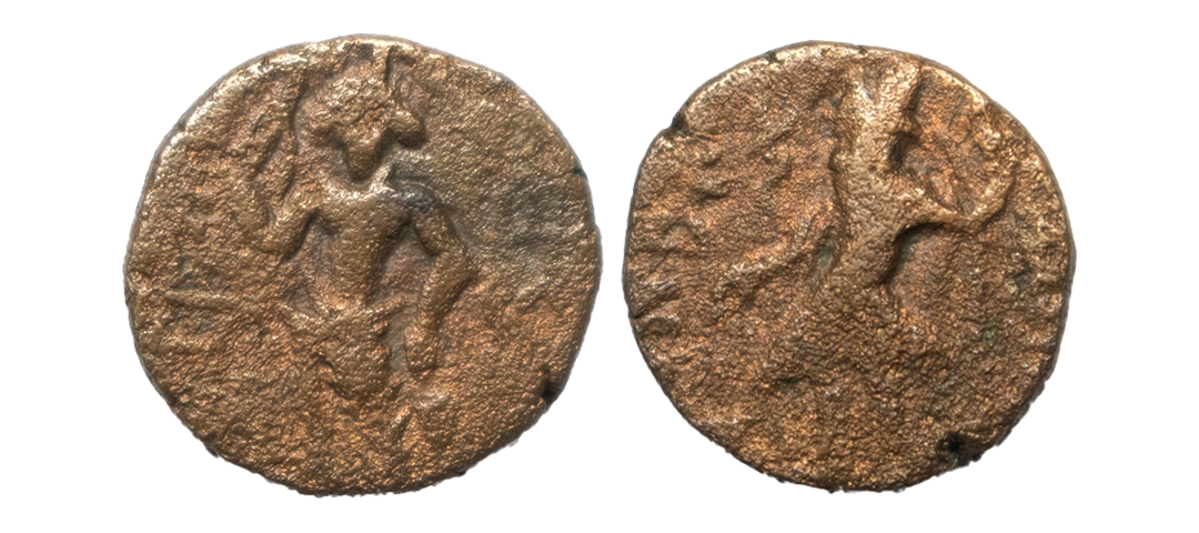Kushanas, Kanishka I (c. 127-158 AD), Copper 1/4 Drachma, 4.29 gms, Obv: King standing facing head left, sacrificing over altar with Greek legend, Rev: Goddess Mao standing to left, about very fine, scarce.