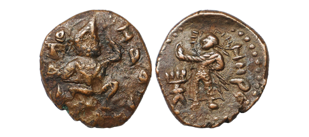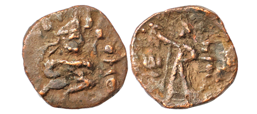 Ancient, Kushanas, Huvishka (155-190 AD), Elephant rider type, Copper Unit, 9.15 gms, Obv. King seated on elephant moving right, Bactrian Greek legend around, Rev. Standing Solardiety ‘Miiro’ with Bactrian Greek legend in right field reading ‘MIIPO’, GOBL #820, fine, scarce.