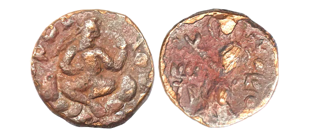 Ancient, Kushanas, Huvishka (155-190 AD), Copper Drachm, 3.18 gms, Obv King seated, Crude Greek legend around, Rev. Solar deity ‘Miiro’ standing facing left, Greek legend ‘MIIPO’ in right field, Tamgha in left field, about very fine, scarce.