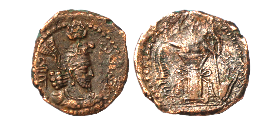 Kushano-Sassanian/Kidarite Huns, Varahan (4th Century AD), Gold Dinara, 7.56 gms, Obv. King standing facing, wearing an elaborate crown, his left hand holding a standard, his right hand at fire altar, fire emerging from his shoulders, wearing a long sword, Trishul behind altar, Tamgha in right field, Bactrian legend around, Rev. Standing deity Oesho (Siva), holding a diadem and trident, behind him Nandi bull to left, Dotted border around, Gobl # 724, Cribb & Jongeward # 2427, very fine, very rare.