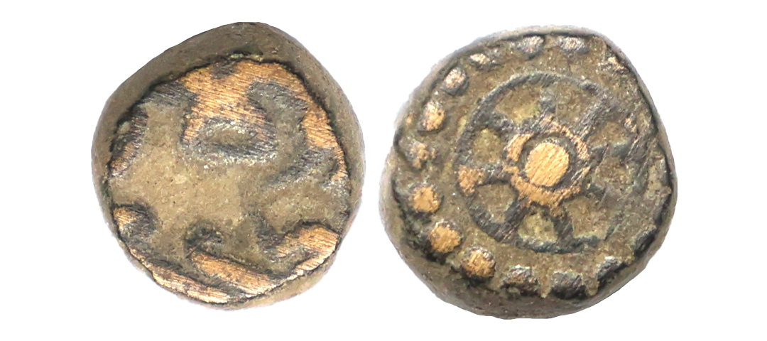 Ancient, Nagas of Padmavati, Devanaga (325-335 AD), Copper Unit, 1.59 gms, Obv. Wheel with eight spokes, Dotted border around, Rev. Circular Brahmi legend reading clockwise as ‘Maharaja Shri Deva’, Pieper # 1312 , fine, scarce.