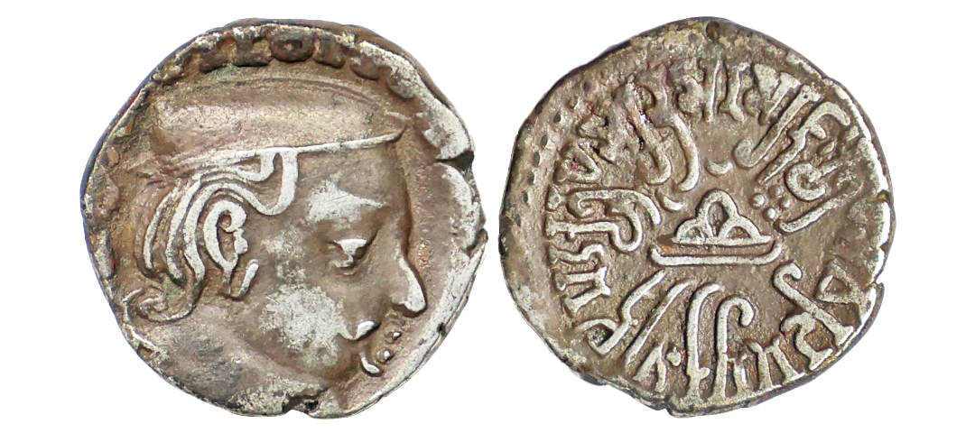 Western Kshatrapas, Rudrasena I (121-144 CE), Silver Drachm, 2.12 gms, Obv: bust of king facing right, date behind, Rev: a three-arched hill with wavy river line below, crescent moon and sun above, the Brahmi legend "Rajno Mahaksatrapasa Rudrasihasaputrasa Rajno Mahaksatrapasa Rudrasenasa" around the field, Fishman # 13.2a.141, very fine, centrally strucked,